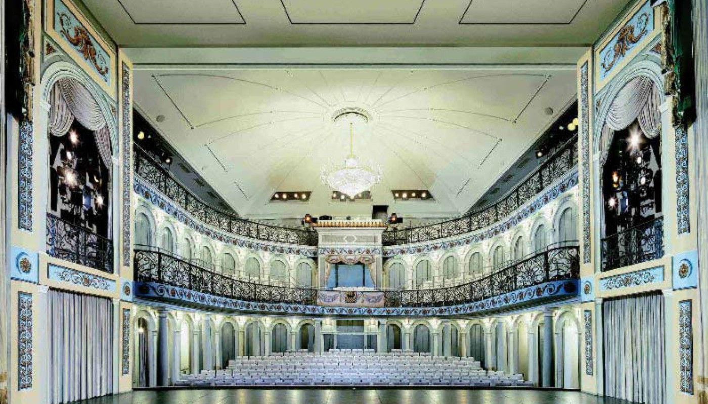 Légèrement transformé en 1826, le bâtiment a été restauré soigneusement de 1992 á 1998. Dès ce jour ce joyau du style classique en Allemagne du Nord resplendit de nouveau dans toute sa beauté. En coopération avec les théâtres à Stralsund et Greifswald (le « Theater Vorpommern ») on donne ici 300 repré-sentations environ par an.