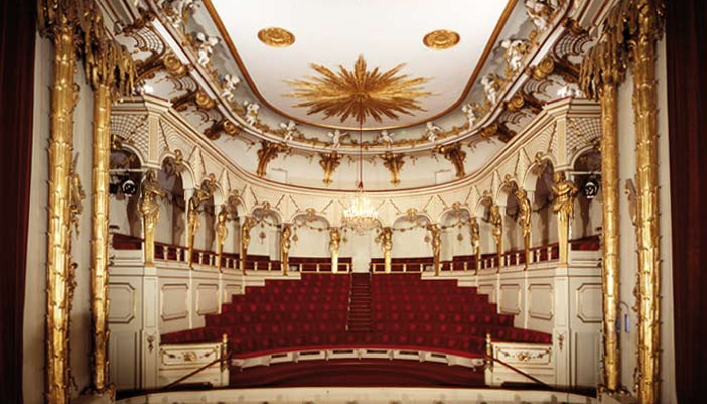 L’extérieur du bâtiment n’indique pas le théàtre, seules les statues sur le toit avec leurs masques et instruments de musique peuvent donner une indication à propos de la fonction de cette partie du bâtiment. La salle en forme d’un amphithéàtre est ordonnée en style rocaille propre à Frédéric le Grand ; les éléments qui dominent sont les hermes et rocailles dorés aussi que le rouge des bancs. Des palmes et des trophées avec des instuments, tous dorés, forment le cadre de la scène. Le théâtre avec ses 226 places présente toute l’année opéra, comédie et ballet.