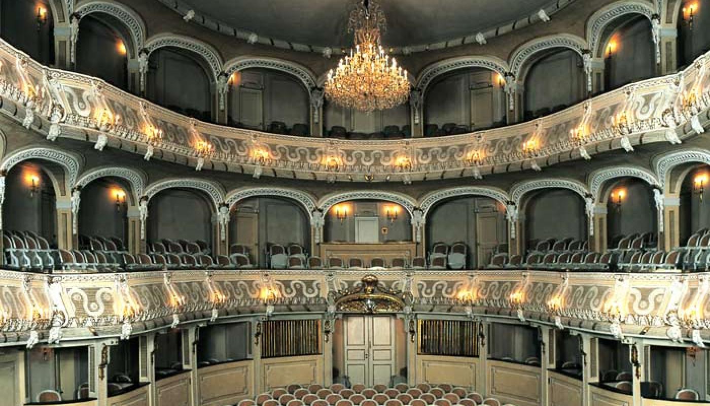 Le Théâtre rococo, conçu par l’architecte Nicholas de Pigage en 1752/53, est le plus ancien théâtre en Europe avec des balcons sans loges. Déjà vingt ans après son ouverture on a essayé de le transformer en style classique sur l’ordre du promoteur des arts, le Prince électeur Carl Théodor du Palatinat. Le maintien des deux styles fait aujourd’hui le charme extraordinaire de cette salle. Au Théâtre rococo jouait à l’époque l’orchestre Mannheimer Hofkapelle et on a donné des œuvres de Voltaire, Mozart, Gluck et J. Chr.