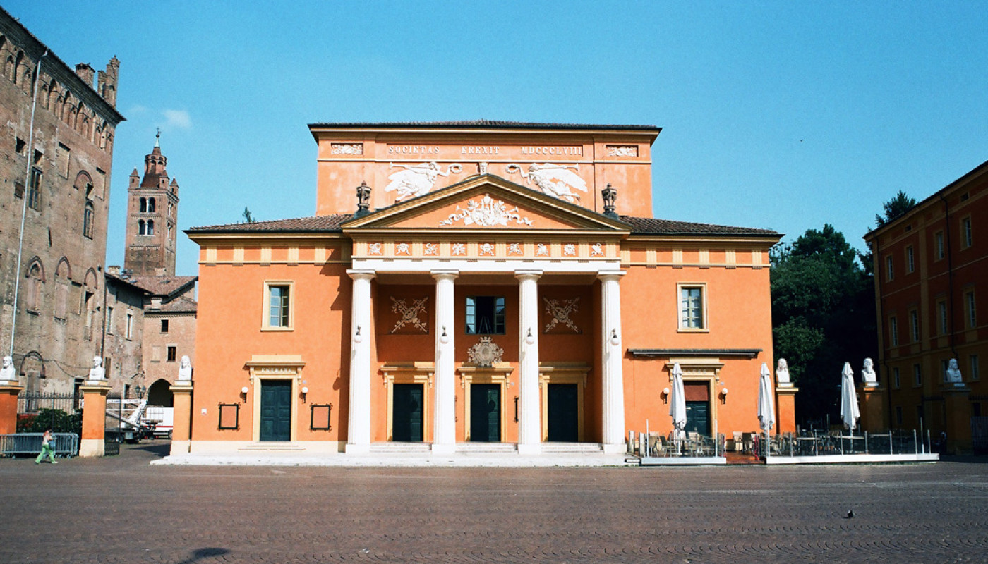 Contrairement à l'inscription sur le portail, le théâtre a été en possession de la ville avant son achèvement et est entièrement dans son état d'origine. Le stucage à l'intérieur est l'œuvre d'artisans locaux alors que la fresque du plafond a été réalisée par Giuseppe Ugolino de Reggia Emilia. Le célèbre rideau de décor, pour lequel les plus belles femmes de la ville ont servi de modèle, lui est également attribué.