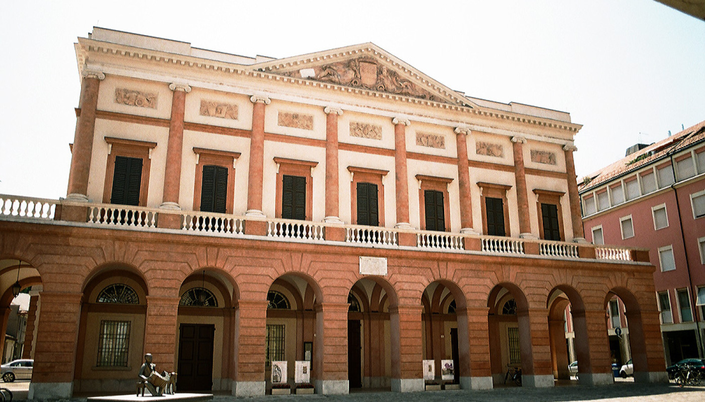 Le théâtre à façade néo-classique dans le style de Piermarini et une des salles conçues par Francesco Migliari pouvant accueillir environ 800 personnes est construit entre 1843 et 1846 d'après les plans de l'architecte Vincenzo Ghinelli. Le plateau est l'un des plus grands d'Europe.